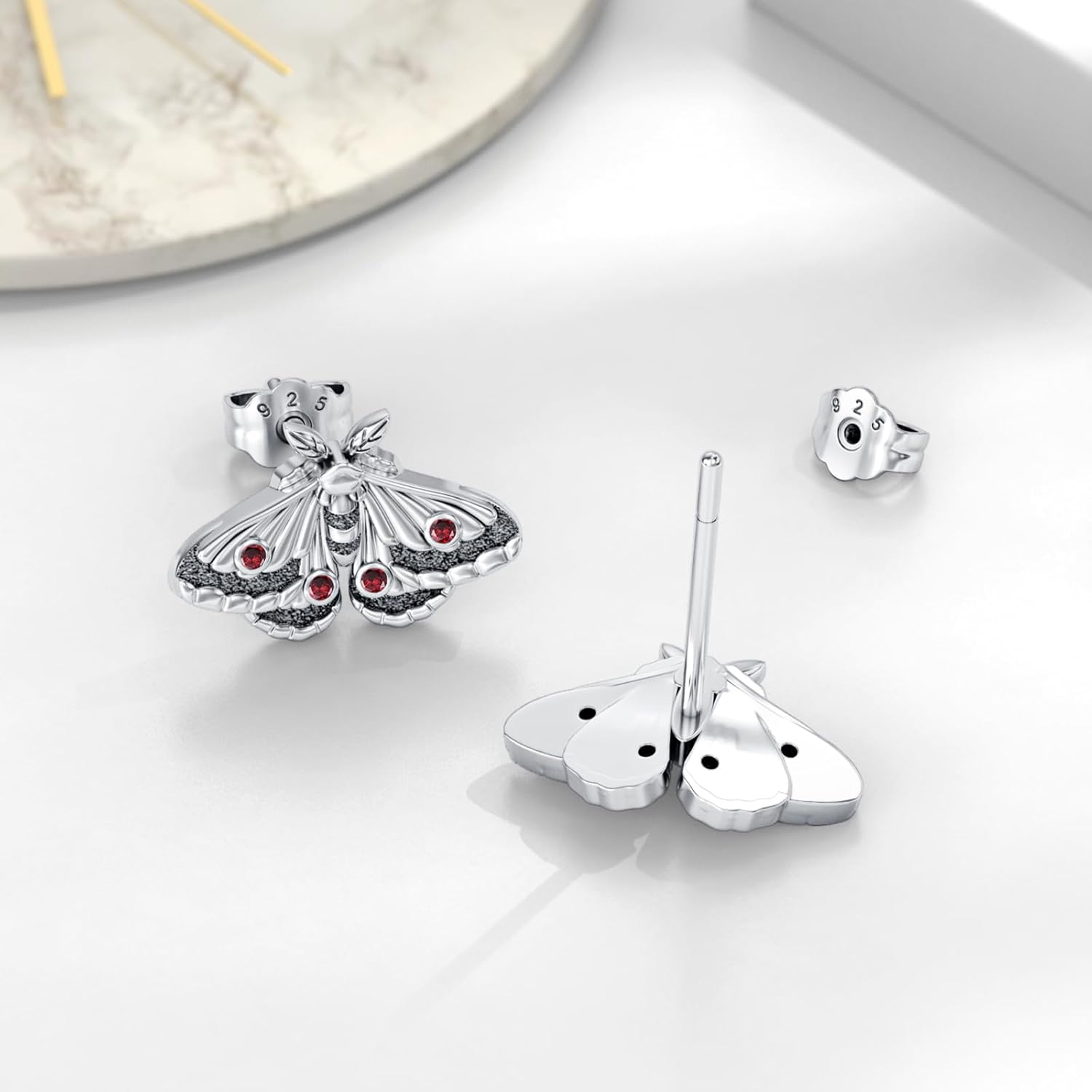 How to Care for Your 925 Sterling SilverTo keep your sterling silver jewellery looking its best:Avoid contact with sweat, bleach and other chemicals.Remove jewellery before showering or swimming.When not worn, store it wrapped in a soft cloth and placed in a sealed plastic zip bag to prevent tarnishing.Regular cleaning and wearing of silver jewellery helps maintain its natural shine.Package Includes1 × moth earrings for women 1 × Elegant Gift Box1 × Silver Polishing Cloth
